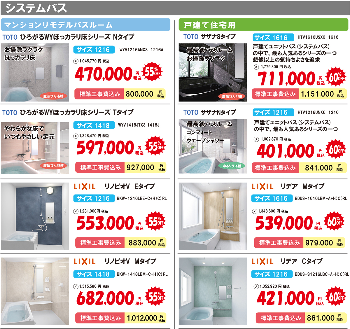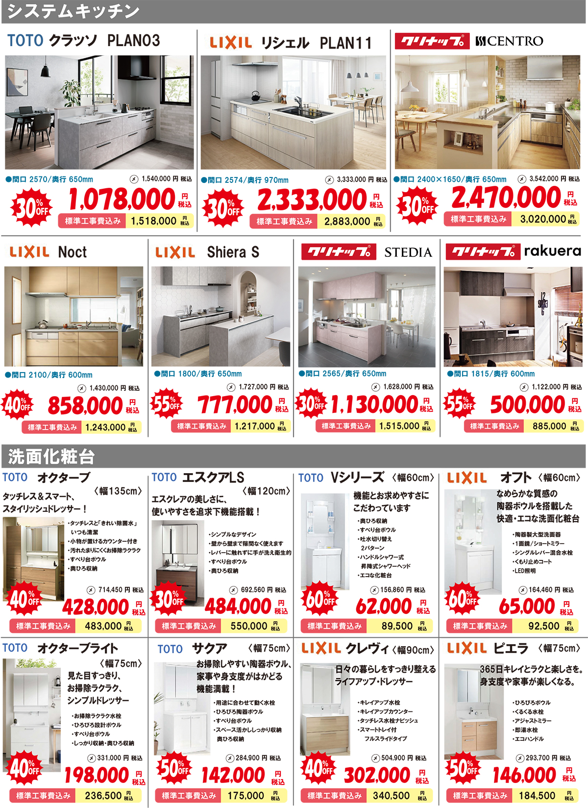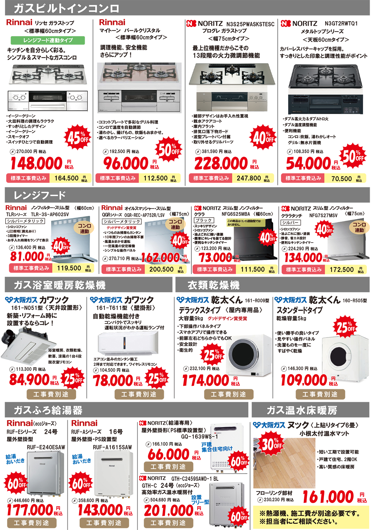 ビルトインコンロ・レンジフード・水栓・据置コンロ・ガス炊飯器・システムキッチン・システムバス・洗面化粧台・ガス温水浴室暖房乾燥機・給湯暖房機エコジョーズ・ガス小型湯沸かし器・ガス温水床暖房などが約25%OFF~約60%OFFになっています!詳しくはチラシをご覧ください。